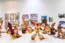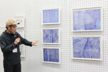 森川里緒奈さんの作品「電車」のコメントをする施設職員