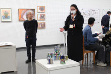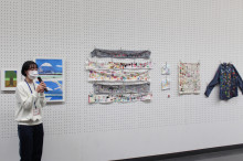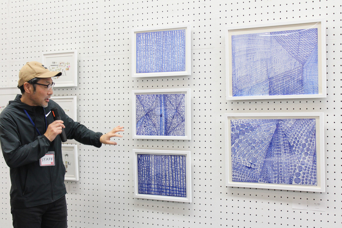 森川里緒奈さんの作品「電車」のコメントをする施設職員
