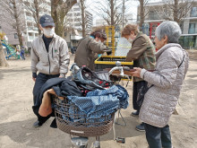 当日は当番4人が集合。最年長88歳の中尾加代子さんが「紙芝居自転車」で到着し、準備を開始。中尾さんは毎回、自宅から20分以上、自転車をこいでやって来る。自転車の荷台を使った手作りの演台を設置するほか、車体を覆い隠す布などを手分けして支度。出演順を決めて各自ピンマイクを装着して自転車を砂場前に移動すると、居合わせた親子連れや、遊びに来ていた保育園児たち20人ほどが砂場に集まった。実演したのは、「はーい!」(脚本=間所ひさこ、絵=山本裕司)や「ふうたのはなまつり」(作=あまんきみこ)など、乳幼児向け作品から童話まで4作。縁石に座って親子でおしゃべりしながら楽しむ様子や、絵を指さして見入る幼児の姿などが見られ、「おしまい」の声がかかると拍手が起きた。