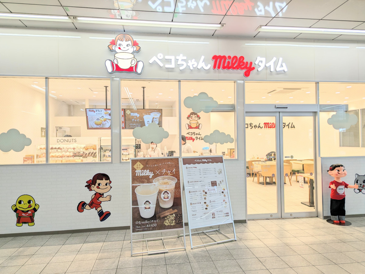 不二家の新業態カフェ「ペコちゃんmilky(ミルキー)タイム」の1号店が埼玉高速鉄道・浦和美園駅改札横にオープンして、1カ月がたった。