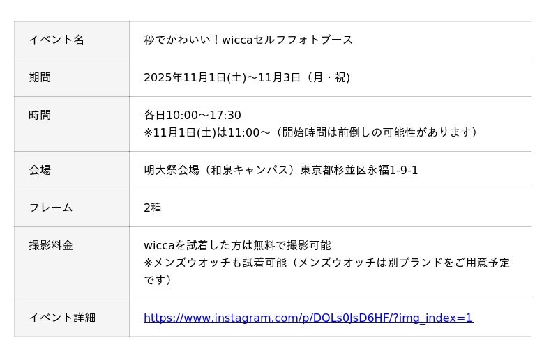 キタムラ・ホールディングス グループのピックハイブ株式会社(本社:東京都新宿区、代表取締役社長 兼 COO:大迫 由典)が運営するセルフフォトブランド「Photomatic」は、2025年11月1日(土)~11月3日(月・祝)の3日間、「明大祭」でウオッチブランド「wicca」が開催する試着イベントに、wiccaと明大祭のロゴがデザインされたオリジナルフレームで撮影できるフォトブースを設置します。