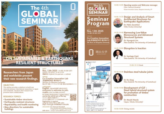 国立大学法人岡山大学(本部:岡山市北区、学長:那須保友)のグリーンイノベーションセンターでは、2025年11月12日(水)14:00~16:00に、本学津島キャンパスの共創イノベーションラボ(KIBINOVE:きびのべ)においてアメリカ、ニュージーランド、日本より5名の構造設計研究者が来日し、講演を行う「The 4th GLOBAL SEMINAR ON SUSTAINABLE & EARTHQUAKE RESILIENT STRUCTURES」を開催します。