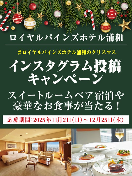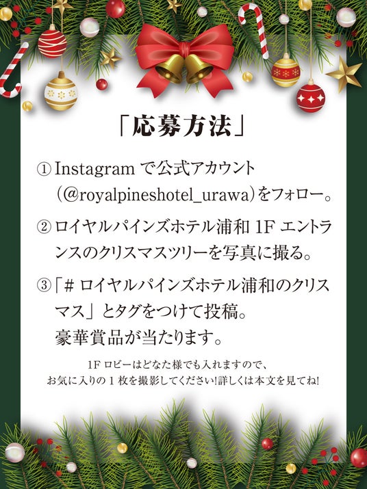 クリスマスイルミネーションの期間中、1Fエントランスにあるクリスマスツリーを撮影し、「#ロイヤルパインズホテル浦和のクリスマス」とハッシュタグをつけてInstagram投稿すると、抽選で豪華プレゼントが当たるキャンペーンを実施中!