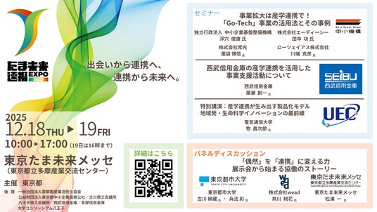 東京都は、多摩地域で唯一の産業振興及び広域的な産業交流を目的とする展示会「たま未来連携EXPO2025」を、東京たま未来メッセ(東京都立産業交流センター)において2025年12月18日(木)、19日(金)の2日間開催いたします。