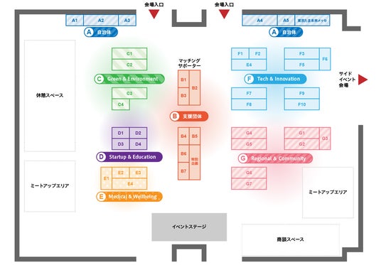 - Startup & Education:スタートアップ支援・学生企業・実践教育をテーマとするゾーン。「学びの社会実装」を体現するエリアとして、学生の創造性や実践力をアピールします。