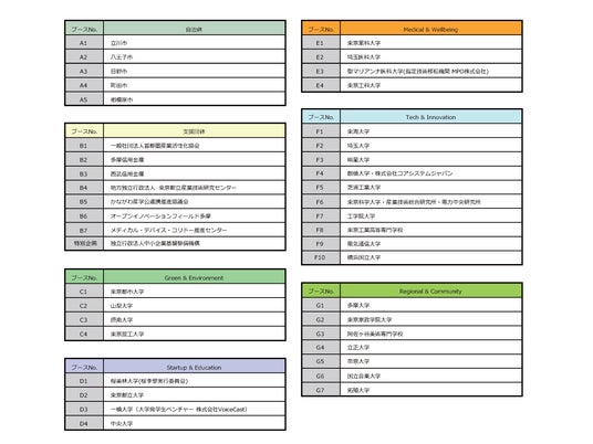 来場者が会場を回遊しやすく、また偶然の出会いが生まれやすいよう、学術機関の出展シーズを以下の5つのテーマに区分し、エリア分けを行っています。