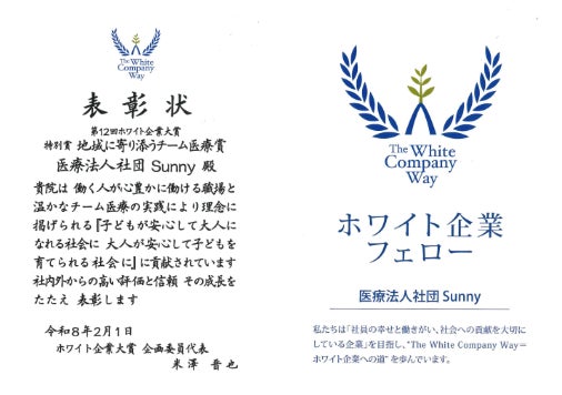 小児科クリニック4院を展開する医療法人社団Sunny、第12回ホワイト企業大賞で特別賞を受賞