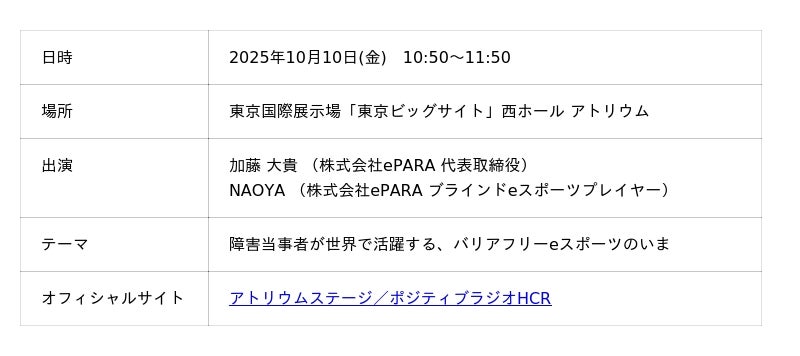 10月10日(金)11時50分から、アトリウムステージで行われるポジティブラジオHCRのなかで、ePARA代表・加藤大貴とブラインドeスポーツプレイヤーのNAOYAが登壇します。