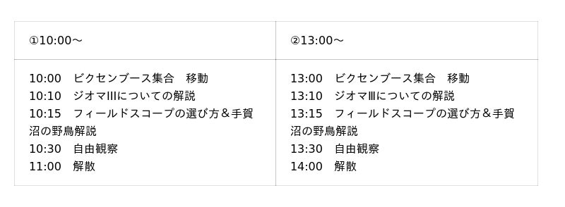 製品の体験はもちろんのこと、講師の千手正教氏によるフィールドスコープの選び方や手賀沼の野鳥解説、広報担当による製品解説などのトークショーも予定しています。