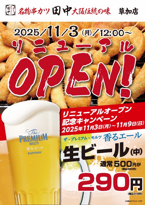 「“楽しい”でつながる世界をつくる」をミッションとする株式会社ファイブグループ(本社:東京都武蔵野市、代表取締役社長:坂本憲史)は、2025年11月3日(月)に「串カツ田中 草加店」をリニューアルオープンいたします。