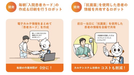 自動化した業務の一例を挙げると、新規入院患者の電子カルテ情報をまとめて「患者カード」を作成する業務では、前日に入院した患者のカードを、翌朝までにBizRobo!が自動作成・印刷まで対応するため、これまで職員が手作業で行っていた工程が不要になりました。