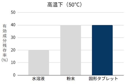 - 高温下(50℃):有効成分残存率は、水溶液が20%に対し、固形タブレット形は40%。液体よりも成分を保持。
