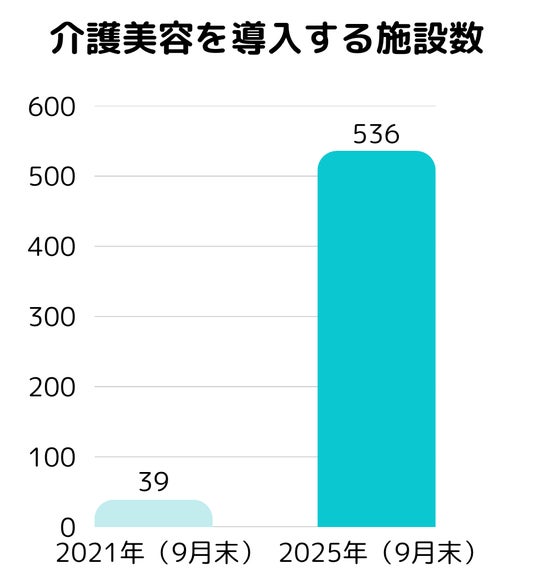 とくに美容領域では、心身の活性効果や自尊心の回復などの側面が評価され、導入する介護施設は4年前から約13倍に増加(当社調べ)。今後ますます、施設ごとに合わせた美容ケアが重要視される見込みです。