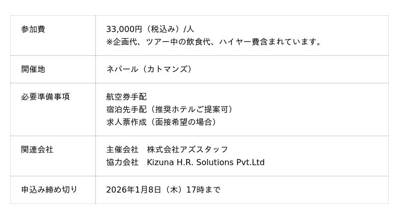 期間は1月の21日(水)~23日(金)にかけて行い、内容としてはアズスタッフが現地で手掛ける教育事業で提携をする日本語学校や教習所の見学、実際の教育現場の視察、希望があればその場で現地面接、候補者のマイクロバスでの運転横乗りなどを行うことが可能となる。また、最終日にはネパールの観光案内なども行っている。