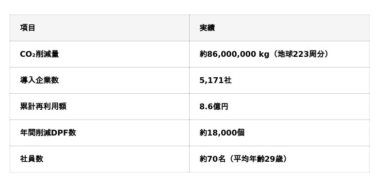 ディーゼル排気を再資源化するDPFリビルト事業を中心に、EVバッテリーや産業廃棄物リサイクルへと領域を広げている。