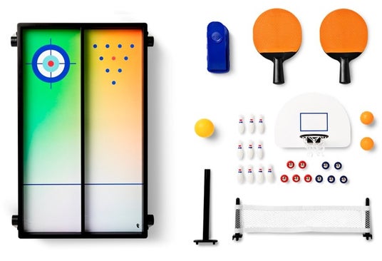 バスケ、卓球、ボーリング、カーリングの4種目がぎゅっと1つに!ミニサイズだからコンパクトにあそべて、とっても便利