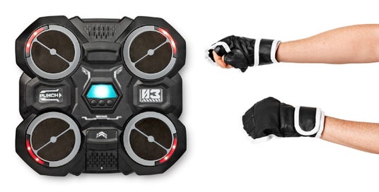 両面テープつきのマジックテープを壁に貼り付けてマシンを設置!音楽と光に合わせてパンチをうちまくれ!