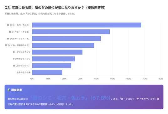 調査では『首・デコルテ』や『手の甲』を気にする方も多くいらっしゃいました。顔だけでなく、露出する部位全体のケアを考えることで、より美しい写真映えが実現します。