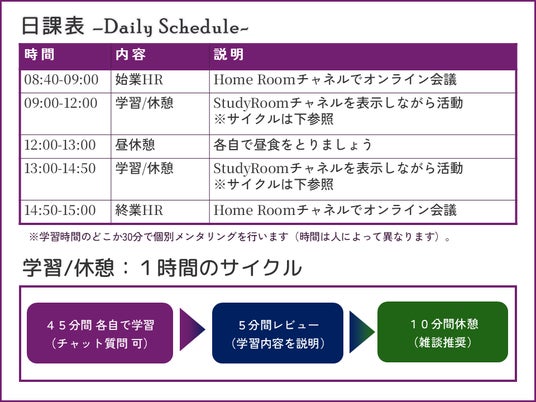 【画像:1日の標準スケジュールと集中サイクル】始業と終業それぞれでオンラインHRを行い、規則正しい生活リズムを維持。さらに学習時間は「45分集中+5分報告」のサイクルを回すことで、ダラダラしがちな自宅学習に規律を設けて時間効率をアップします。