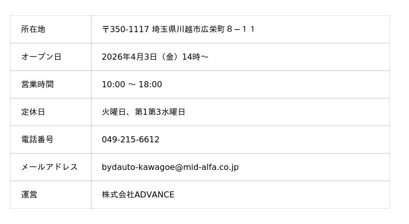 BYDの日本法人であるBYD Auto Japan株式会社(本社:神奈川県横浜市、代表取締役社長:東福寺 厚樹、略称:BAJ)の正規ディーラーである株式会社ADVANCE(アドバンス)(本社:東京都千代田区、代表取締役社長:相川 政二)は、2026年4月3日(金)に、埼玉県内第4店舗目となるショールームを備えた正規ディーラー店舗「BYD AUTO 川越」をオープンします。また、4月3日(金)、4日(土)、5日(日)の3日間には、今年の夏に発売を予定しているBYDの電気で走る軽自動車「BYD RACCO」を特別展示、近隣の皆様に、いま話題の注目モデルを間近にご覧いただけるようにいたします。