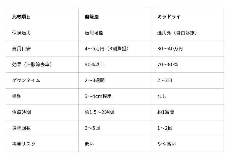 ワキガ治療法の比較(剪除法 vs ミラドライ)