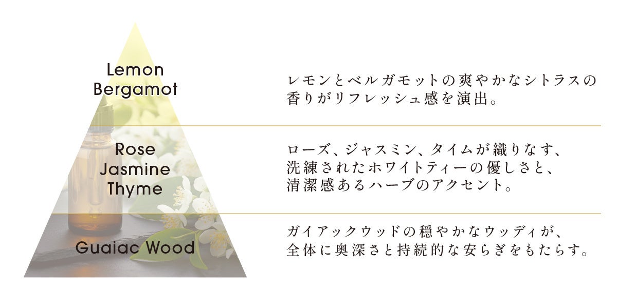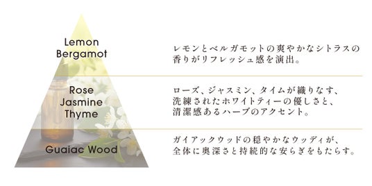 トップノートにレモンとベルガモット、ミドルノートにローズ・ジャスミン・タイム、ラストノートにガイアックウッドを採用しています。従来品と比べ、より自然で穏やかな香り立ちを実現しています。天然精油が持つ効果から、ウェルネス領域やマインドフルネスへの効果も期待できます。