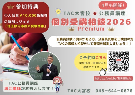 公務員試験対策講座を展開しているTAC株式会社(東京都千代田区)は、TAC大宮校にて「公務員講座 個別受講相談2026 Premium」を4月も開催中です。