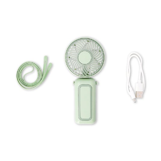 首にかけて使用でき、ファン部分を曲げることで顔に送風できる仕様。両手が空くため、作業中や移動時にも便利です。ストラップ&USBケーブル付き