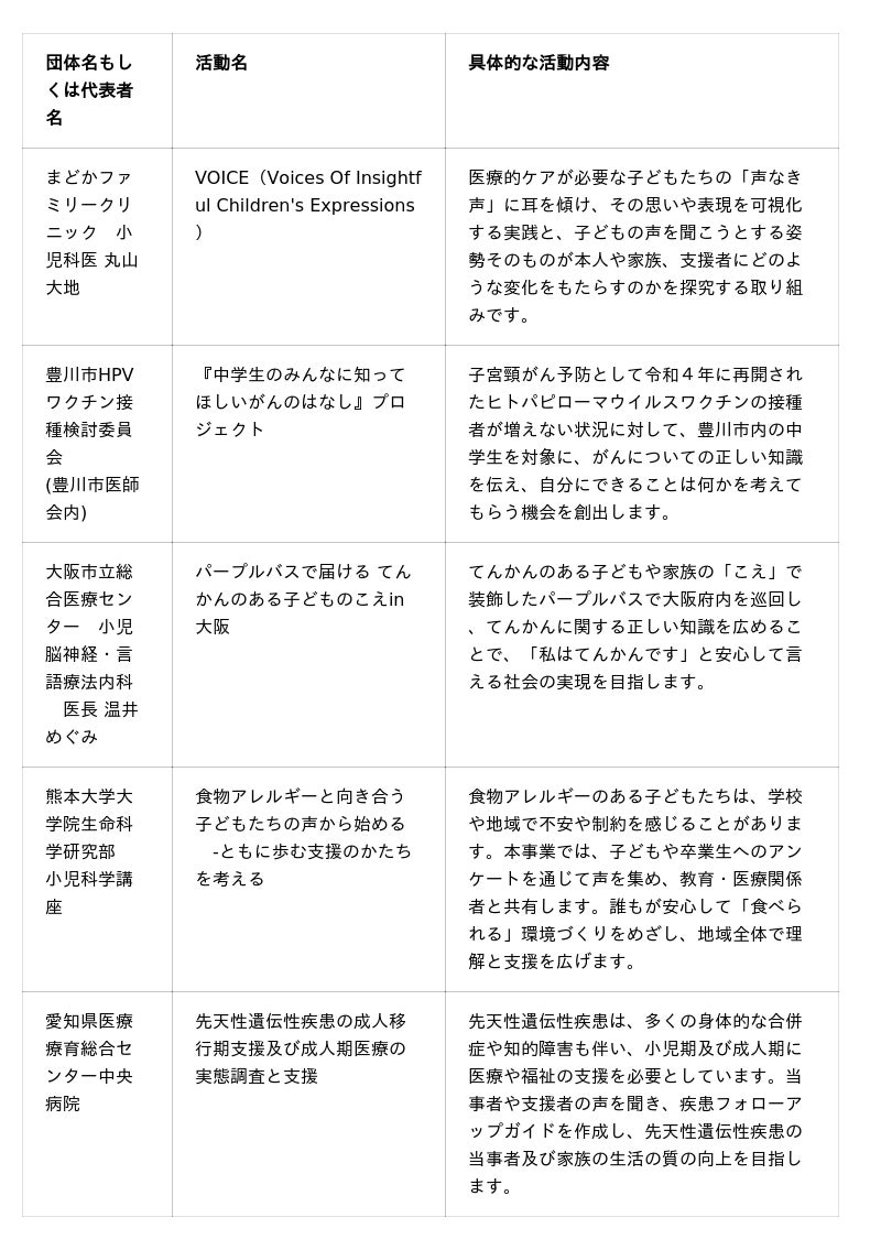 子どもの健やかな成長を実現するため、医師が地域と協働して行うアドボカシー活動(子どものこえの代弁者としての活動)に対して助成金の交付を行います